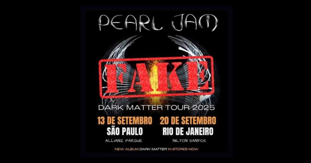 Golpe – Anúncios promovendo um suposto show da banda Pearl Jam no Brasil surgiram nos últimos dias no Instagram, mas se trata de uma tentativa de golpe. Os posts direcionam para um site falso que imita a plataforma de venda de ingressos Eventim, embora a banda norte-americana não tenha datas confirmadas no país.